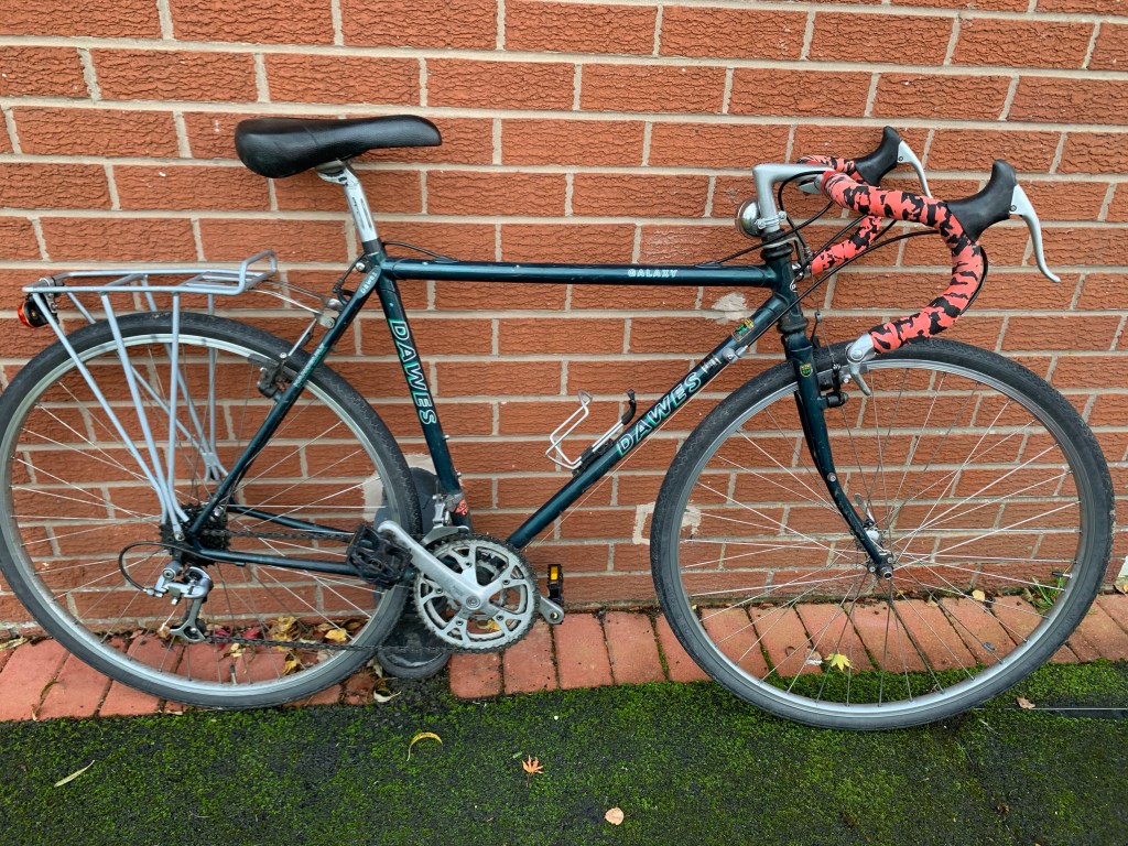 This my friends is perhaps one of the most well loved and certainly longest lasting models of bicycle ever produced. It’s a Dawes Galaxy of approximately mid 1990’s vintage with more miles under its hubs than the Space Shuttle, mine for a piffling £130. So what did the scrapings of my disposable income buy me? Well as bikes go the Dawes galaxy is definitely a British classic. Beloved of touring aficionados, and a mainstay of that very British pastime of the long distance Audax ride these steel framed beasts can be seen tootling along country lanes all over the country and beyond. It’s Reynolds 531st frame is built to last with enough braze-on’s to let you bolt racks to both ends and the clearance to run those all important mudguards. This very pre-loved example came complete with a classic Shimano 7 speed cassette on the back and a Biopace (remember them anyone?) Triple chainset up front. Shifting the sprockets is handled by the classic bar-end shifter which for many years was the only choice for the rather disparate cycling disciplines of Touring and Cyclo-cross. Here’s some detail pictures of the new steed in all its glory……