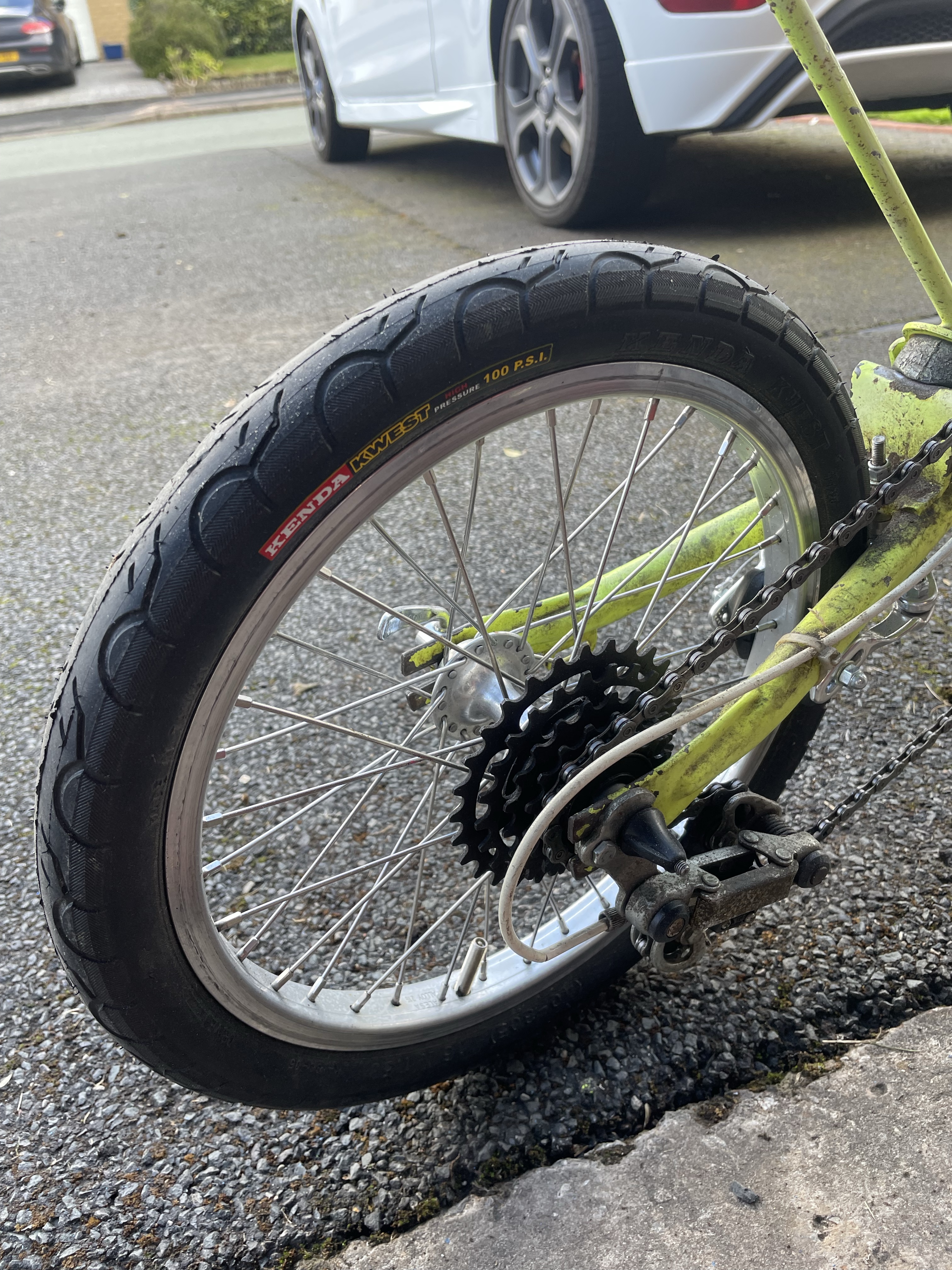 So when the dust had settled and the heat of the bay bidding wars were over it turned out I was actually the only person in the country seemingly after the bits required to upgrade the wheels on a Moulton Mini because I won all the auctions as the only bidder. A few days later all my purchases had arrived and I was now the proud owner of a completely new front wheel in the slightly bigger 305 diameter rim size, a pair of rare 305 size rims with 28 spoke holes and a set of Kenda 16′ x 1.50 tyres and inner tubes to match.(total cost including postage, less than Β£10) I dove back into eBay for a suitable rear hub and found an old Suntour track hub with the right 120mm width that would accept a screw on free wheel and I was all set.
