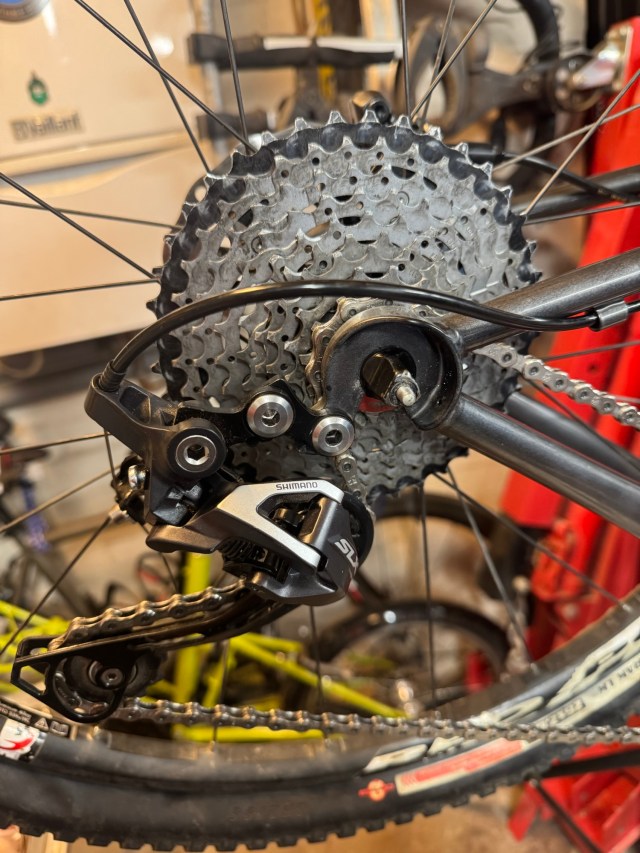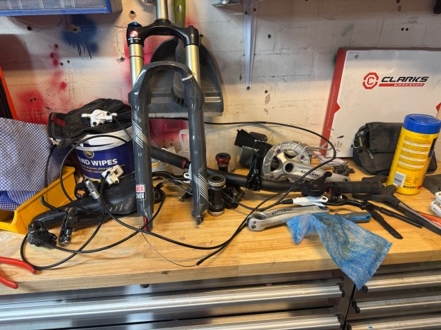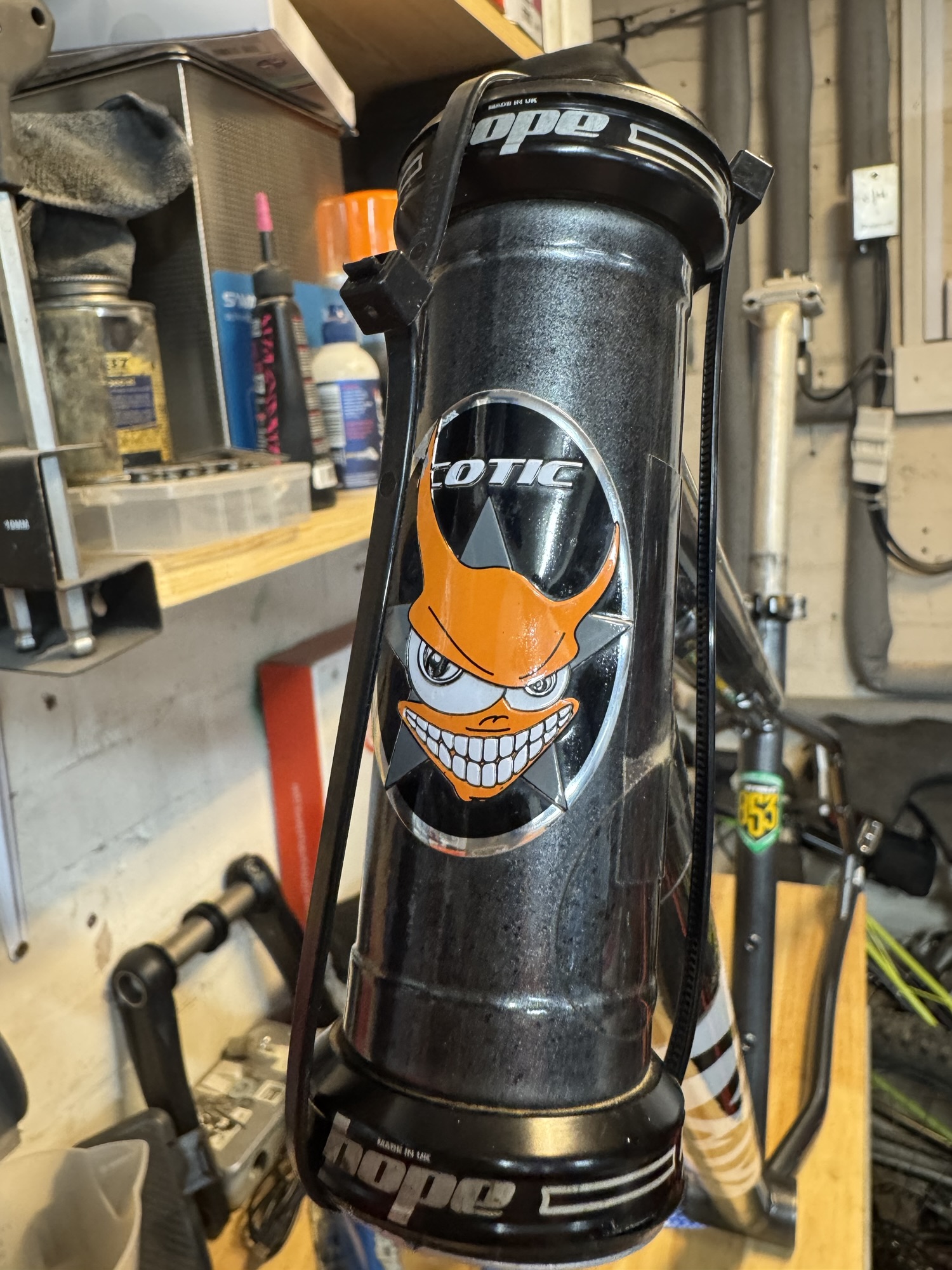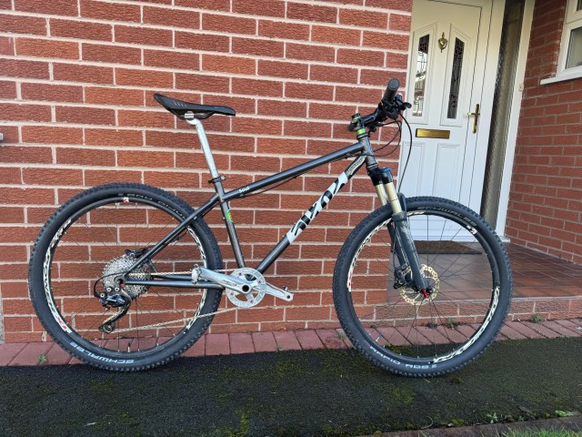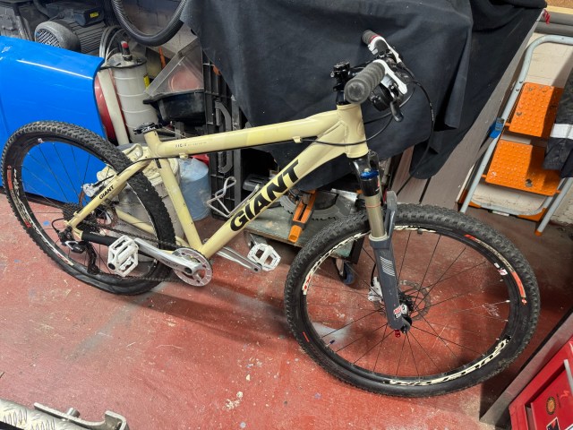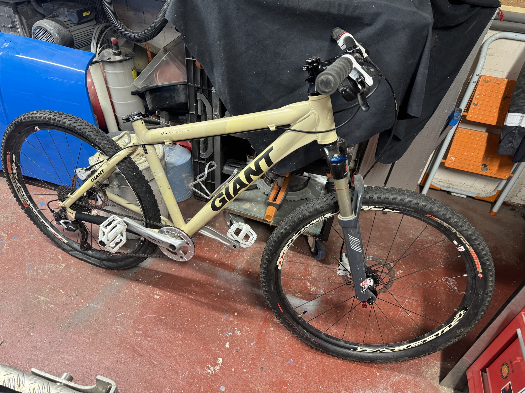 Anyway lets get back to what I was going to do with this latest acquisition to the fleet. Needless to say as ever funds were a little (non-existent) tight so this build had to be very much a budget project. Luckily I did have the seeds of a plan in place before I’d committed to buy the frame. It just so happened that I knew of the perfect doner bike – languishing long unused at the back of a pile of other bikes in my friend Ian’s front room was a little Giant hardtail that he’d originally built up for his daughter. The bike hadn’t been ridden for a very long time and seeing as said daughter had decamped to Australia for at least the imminent future it was just going to continue collecting dust and I knew that he was looking to thin out the pile of two wheeled bikes of yesteryear for a nominal sum. In this case the nominal sum was the set of boost spec cranks I’d bought in error for my full suspension Cotic rocket that were still sitting on my work bench, and the promise of funding some hop based refreshment in the near future.