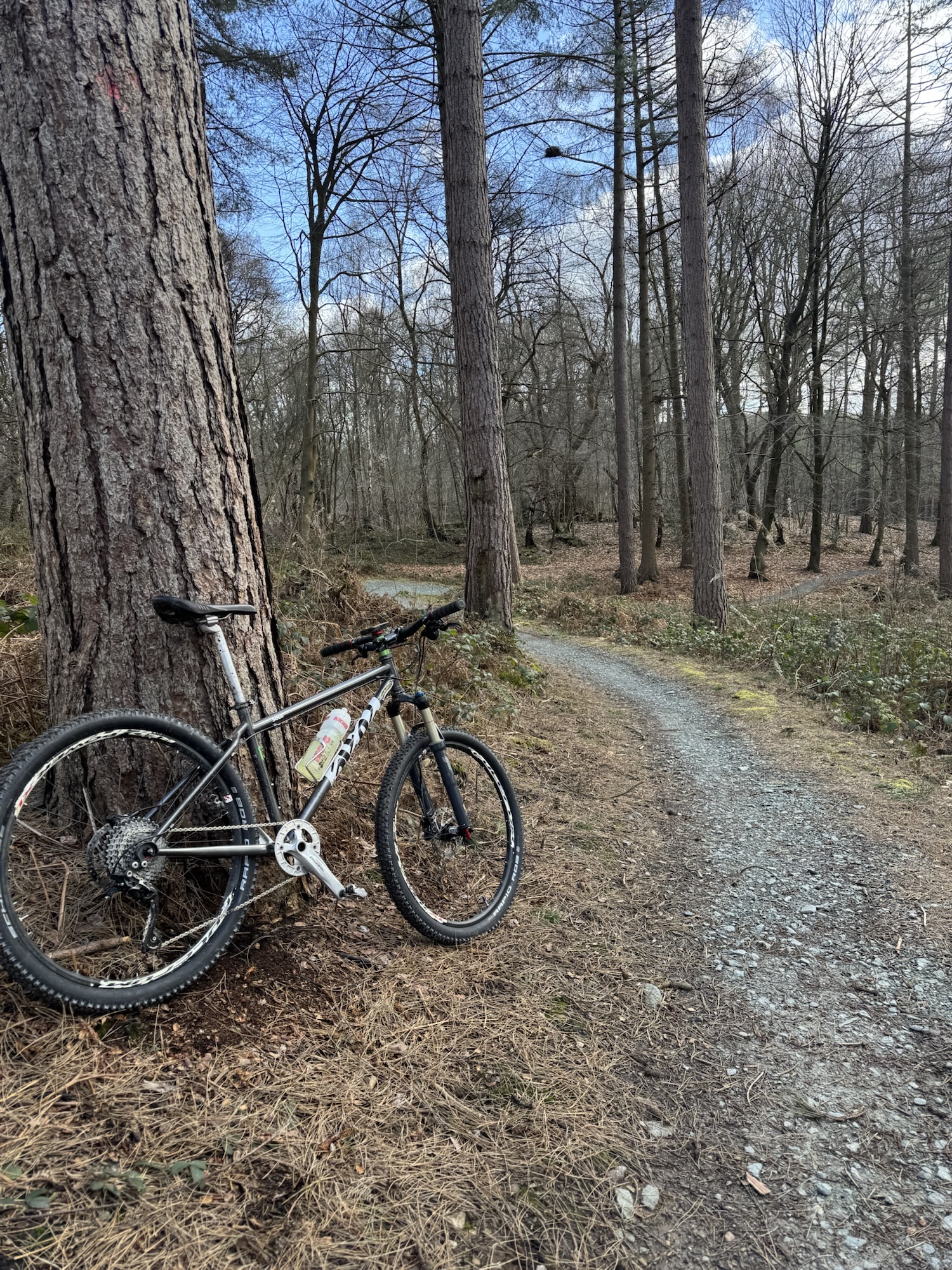 The next question was of course what is this bike exactly for? I know from previous bitter experience that pointing may aging collection of aches and pains down anything gnarly on this bike was going to result in a fast trip straight to the face down position on the chiropractors bench, anything rough and rocky was going to remain firmly the task of my fully suspended 27.5′ wheeled Cotic Rocket. Fast flowing blue graded single track was where this bike was going to shine so for its shakedown ride I took it to Delamere Forest where I’d heard that there were some really nice sections of singletrack had been put in linking some of the network of forest fire roads that criss-cross the woodland. I hadn’t ridden at Delamere for many years so I was eager to see these new tracks, and it seemed like a safe low consequence option if my cobbled together dream machine had a mechanical woopsie a few miles into its maiden voyage.